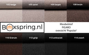 Deze boxspringset Oona is uitgevoerd met de mooie meubelstof FIGARO. Het patroon herkent u als een echt geweven stof met een rustig uni dessin. De samenstelling is 100% Polyester. Hierdoor is het een sterke meubelstof. Figaro is kleurecht. U kunt de Figaro online in 8 populaire kleuren bestellen.